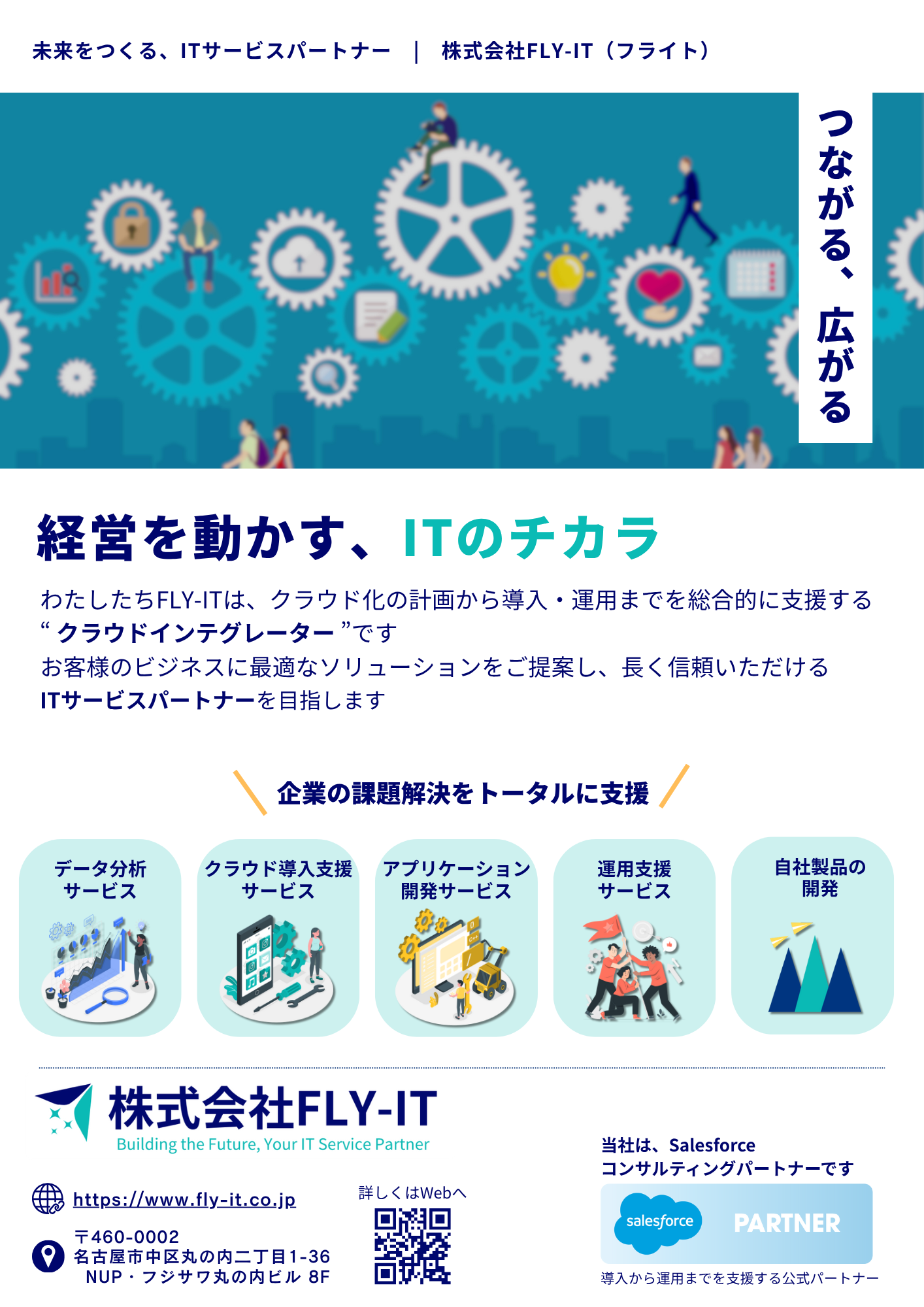 情報 株式会社FLY-IT FLY-IT(フライト)― 信頼できるクラウドインテグレーションパートナー####FLY-ITは、日本を拠点とするクラウドインテグレーターです。SalesforceおよびTableauを中心としたソリューションに特化し、クラウド導入の企画・構築から運用まで、ワンストップでご支援いたします。##中小企業のお客様を中心に、最適なSalesforce環境の構築と業務価値の最大化を実現するためのカスタマイズ・コンサルティングをご提供しています。新規導入はもちろん、既存環境の改善・拡張もお任せください。####【主なサービス】## ❖ Salesforce## ・導入支援サービス## ・アプリケーション開発サービス## ・運用支援サービス## ❖ Tableau## ・データ可視化・分析サービス####FLY-ITは、お客様のビジネスに深く寄り添い、信頼できる長期的なITサービスパートナーとして、##ともに成長し続けることを目指しています。####まずはぜひ、お気軽にご相談ください。