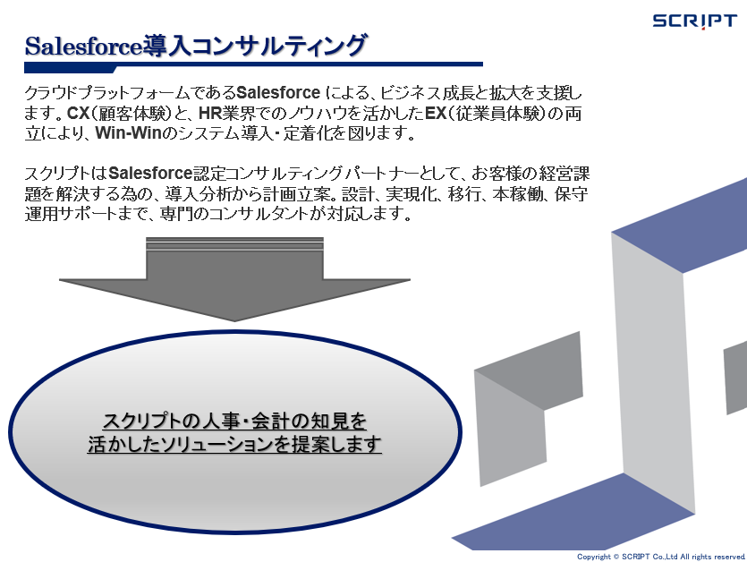 私たちは人事システム導入コンサルティングに特化したサービスを提供して25年。####2021年3月にSalesforce認定パートナーを取得。##人事/会計におけるコンサルティング実績を強みに「Salesforce×人事」 のサービス提供事業をスタートしました。####基礎となるCRMを習得の上で、スクリプトの人事・会計の知見を活かしたソリューションの提案・実現します。