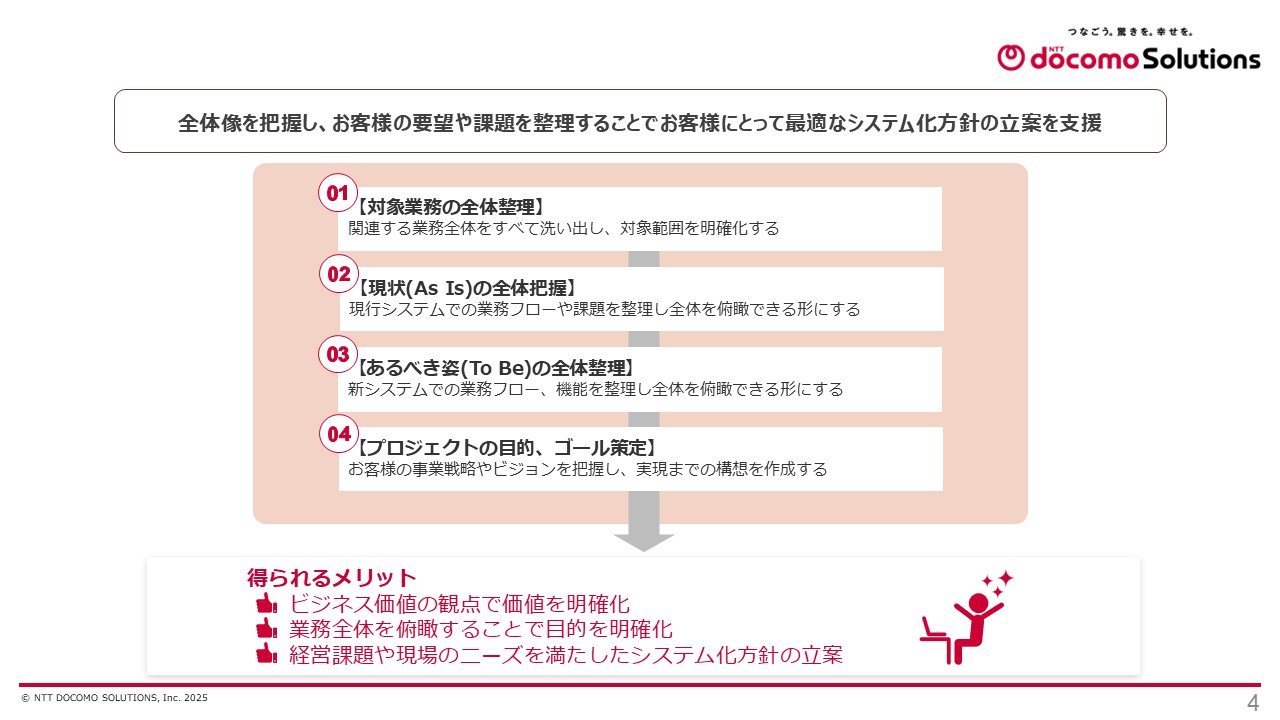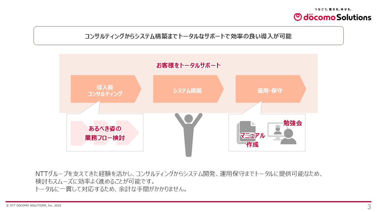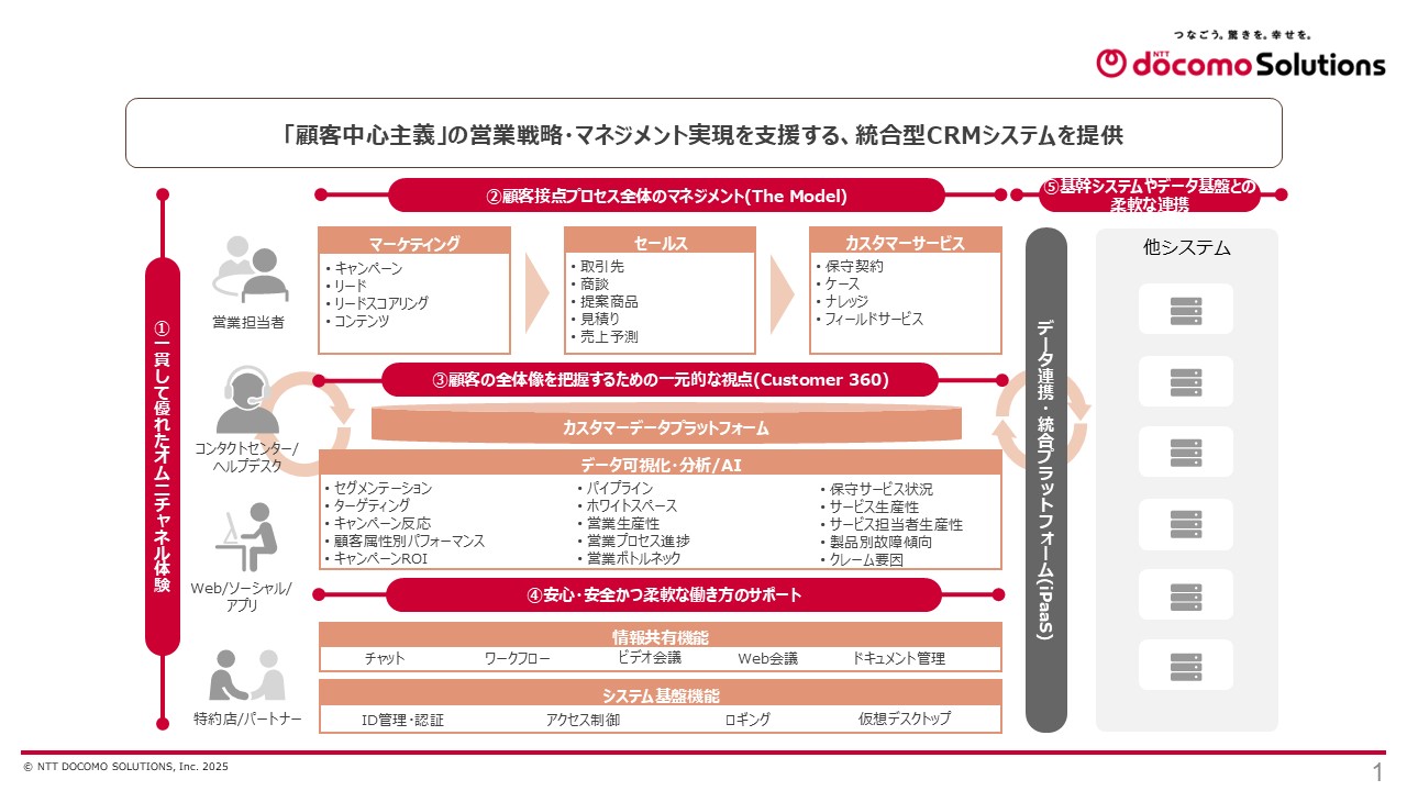 顧客の全体像を部門横断で理解することで、顧客のニーズを先回りした提案・サービス提供をタイムリーに実施。##NTTドコモソリューションズは、こうした「顧客中心主義」の営業戦略・マネジメントを支援する統合型CRMシステムを提供します。