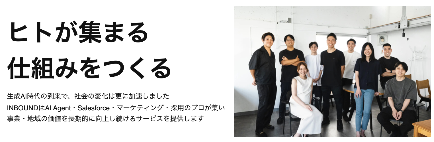 情報 INBOUND株式会社 「ヒトが集まる仕組みをつくる」をビジョンに、AIエージェント構築支援・Salesforce導入・活用支援・マーケティング支援・採用支援の事業を運営。Salesforce関連のプロダクトでは、Core製品、MA(Marketing Cloud, Account Engagement), BI(Tableau, CRM Analytics), ExC(各種Communityサイト), その他(Heroku, Mulesoft)等の構築・運用の支援を行っています。事業会社にてSalesforceを活用し事業を伸ばした経験を持つ経営陣に加え、ITコンサル・事業会社双方のバックグラウンドを持つメンバーが在籍することから、顧客満足度94%と高い満足度のデリバリーが強み。