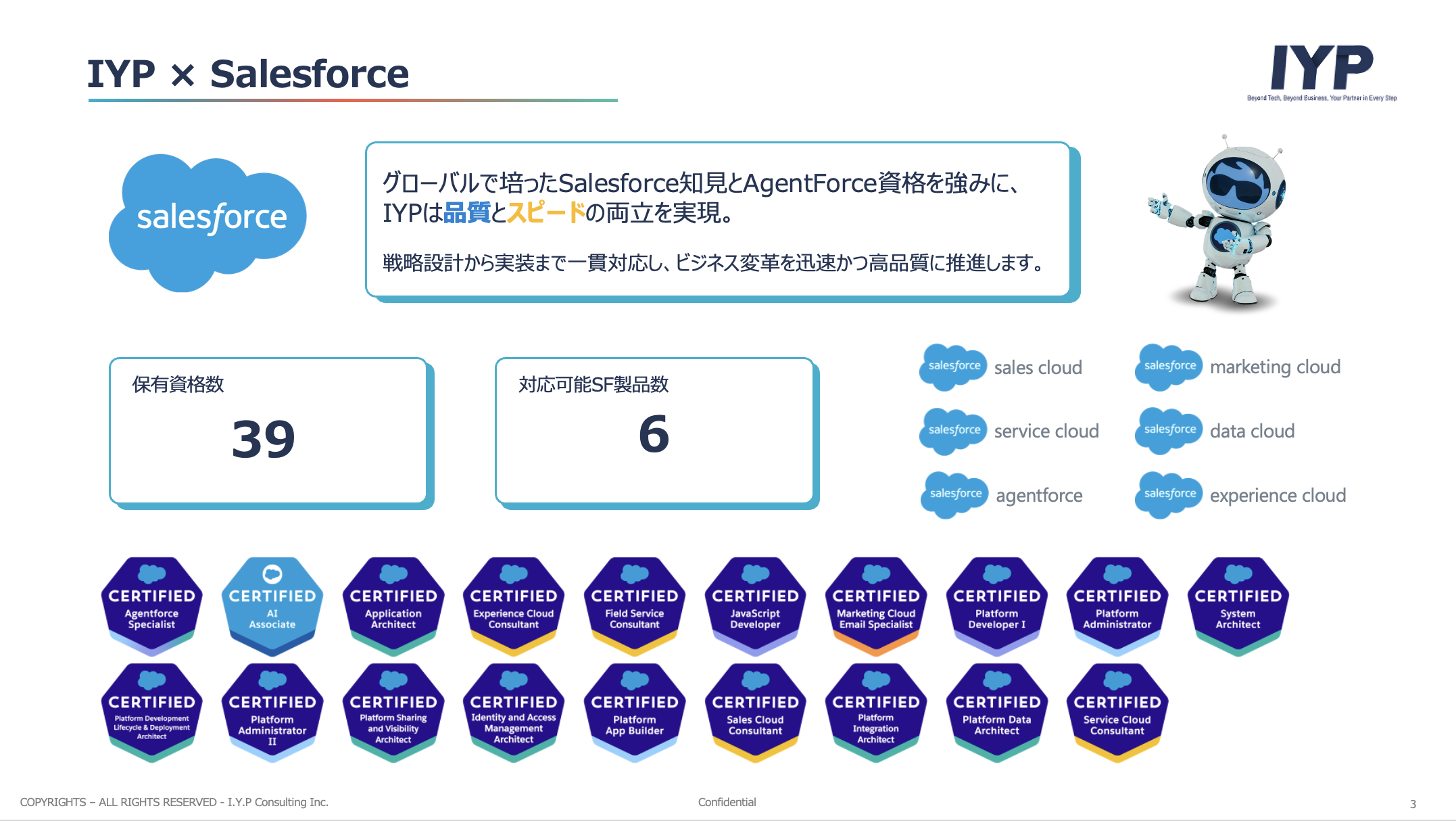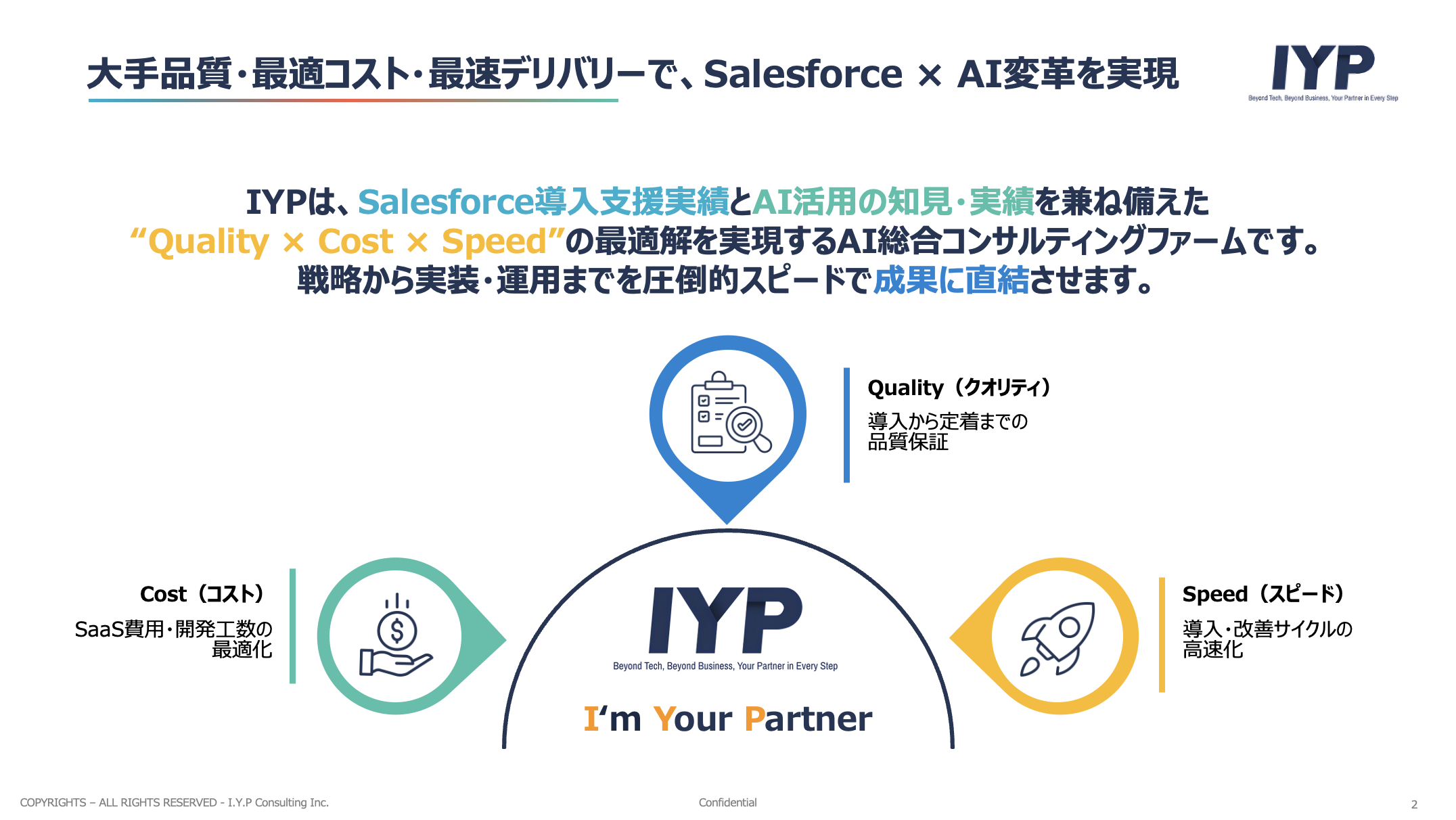 株式会社 I.Y.P Consulting は、Salesforce導入・業務改革・AI統合支援を通じて企業変革を支援するAIドリブン・コンサルティングファームです。Salesforceの最適設計から業務定着化、AI活用による高度化まで一気通貫で支援。「I’m Your Partner」の理念のもと、顧客の伴走者として成果にコミットし、スピードと品質で変革を実現します。